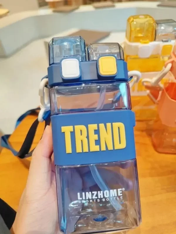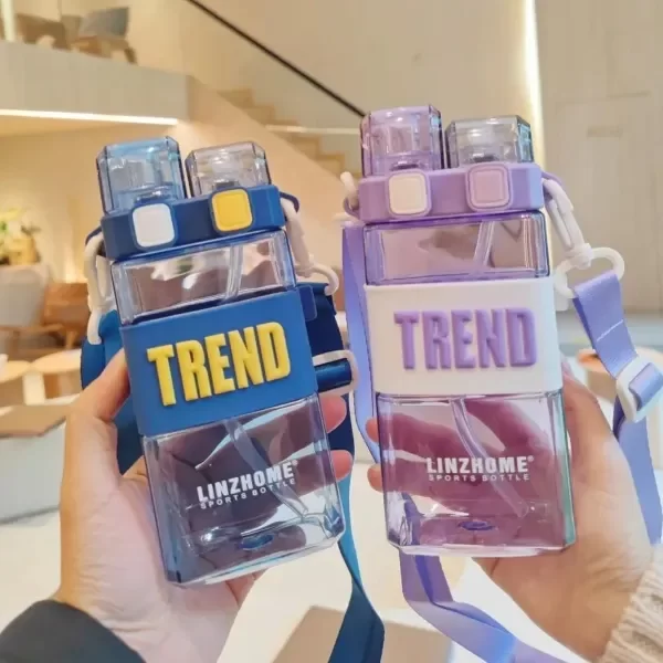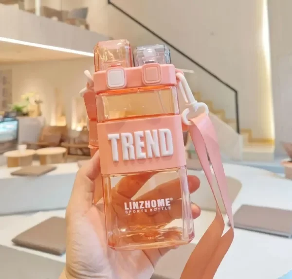 BOTELLA PLÁSTICA TRANSPARENTE CON PICO DOBLE. TRAE SORBETE Y PICO PARA SERVIR. VIENE CON CORREA ESTAMPADA PARA COLGAR.