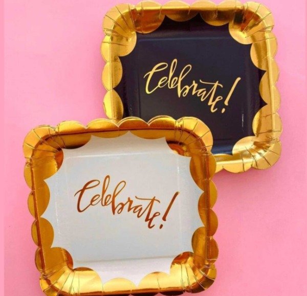 Fondo de color a elección con borde metalizado y frase "Celebrate!".